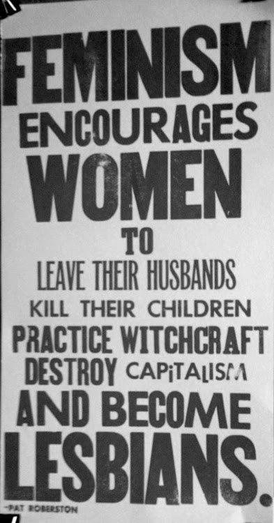 | "El feminismo alienta a las mujeres a dejar a sus maridos, matar a sus hijos, practicar la brujería, destruir el capitalismo y convertirse en lesbianas" Pat Roberston |